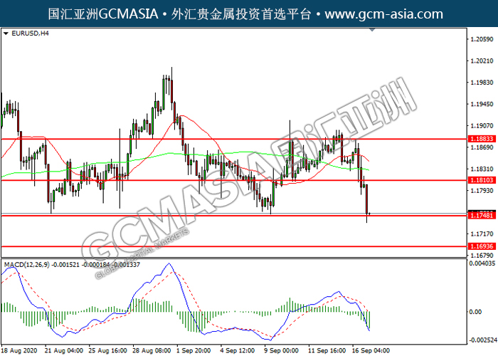 EURUSD,H4:欧美空头排列,目前测试前期支撑。MACD空头动能略增,若下破可关注空头为主。上方关注1.1810压力和1.1885压力,下方关注1.1750支撑和1.1695支撑。