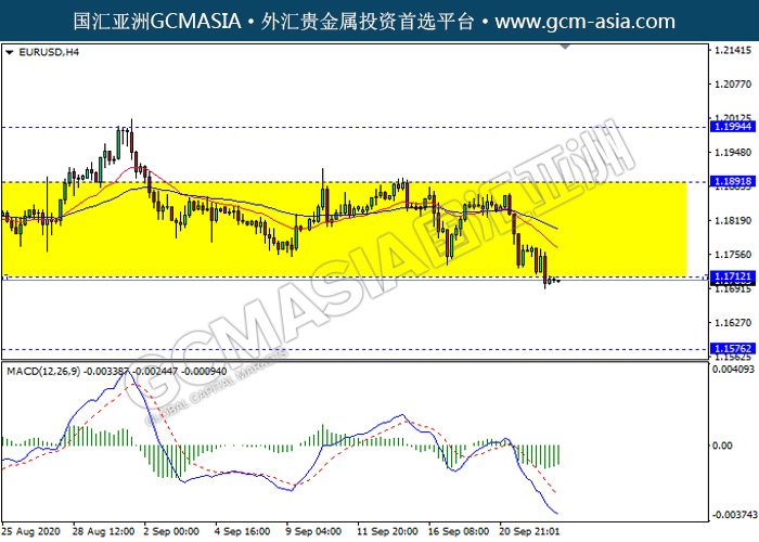 EURUSD,H4:欧美震荡下行,目前测试前期支撑。然而,MACD空头动能有所略略减,短期关注多头反弹趋势为主。上方关注1.1890压力和1.1995压力,下方关注1.1710支撑和1.1575支撑。