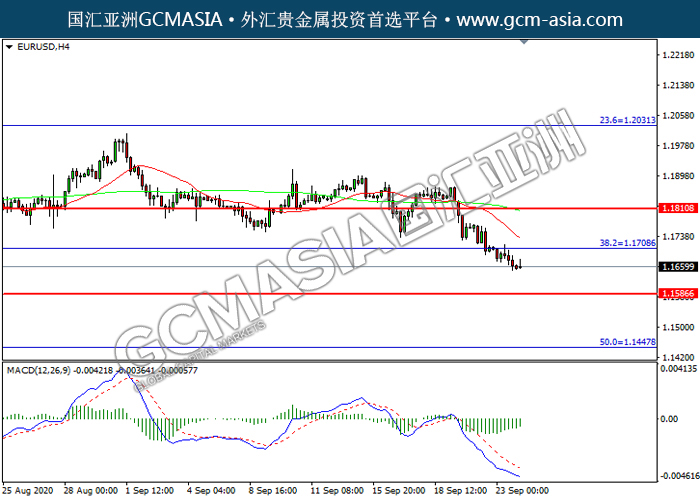 EURUSD,H4:欧美下破前期支撑,震荡下行。然而,MACD空头动能略减,短期可关注技术性回调为主。上方关注1.1710压力和1.1810压力,下方关注1.1585支撑和1.1445支撑。