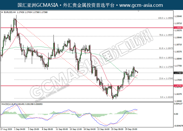20201002 EURUSD by willy | Oct 2, 2020 | 欧元兑美元 | 0 comments GCMAsia - EURUSD EURUSD 2020-10-02 EURUSD,H4:欧美受承压回落。MACD多头动能有所略减,短期关注空头势力。上方关注1.1760压力和1.1800压力,下方关注1.1705支撑和1.1675支撑。