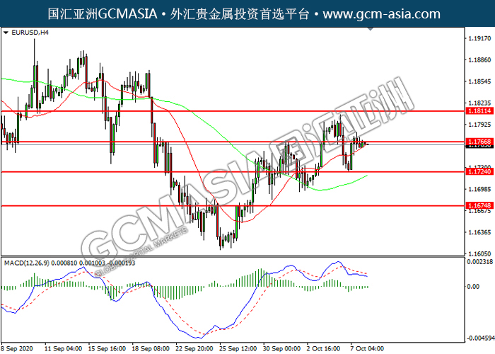 EURUSD,H4:欧美低位反弹,目前测试前期压力。MACD空头动能略减,若突破可关注多头为主。上方关注1.1765压力和1.1810压力,下方关注1.1725支撑和1.1675支撑。
