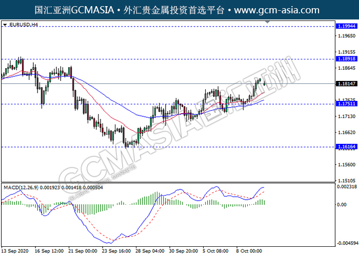 EURUSD,H4:欧美近期低位反弹。然而,MACD多头动能开始略减,短期关注技术性空头回调为主。上方关注1.1890压力和1.1750压力,下方关注1.1750支撑和1.1615支撑。