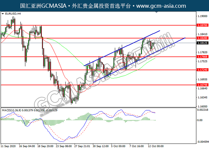 EURUSD,H4:欧美低位反弹,目前靠近前期压力。然而,MACD空头动能略增,短期可关注技术性回调为主。上方关注1.1830压力和1.1870压力,下方关注1.1765支撑和1.1725支撑。