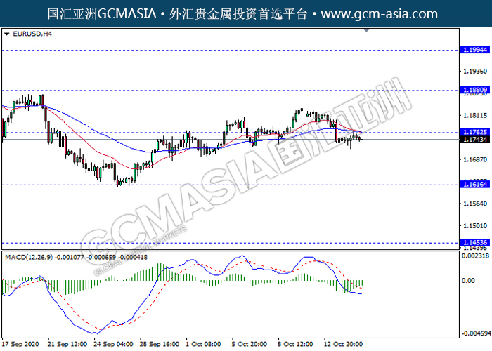 EURUSD,H4:欧美震荡盘整靠近前期压力。然而,MACD显示空头信号,动能略减,中期关注空头趋势为主。上方关注1.1760压力和1.1880压力,下方关注1.1615支撑和1.1455支撑。