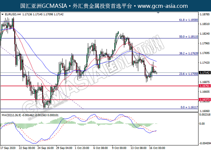 EURUSD,H4:欧美高位承压后回落。然而,MACD空头动能有所略减,短期可关注技术性上调为主。上方关注1.1765压力和1.1810压力,下方关注1.1705支撑和1.1675支撑。