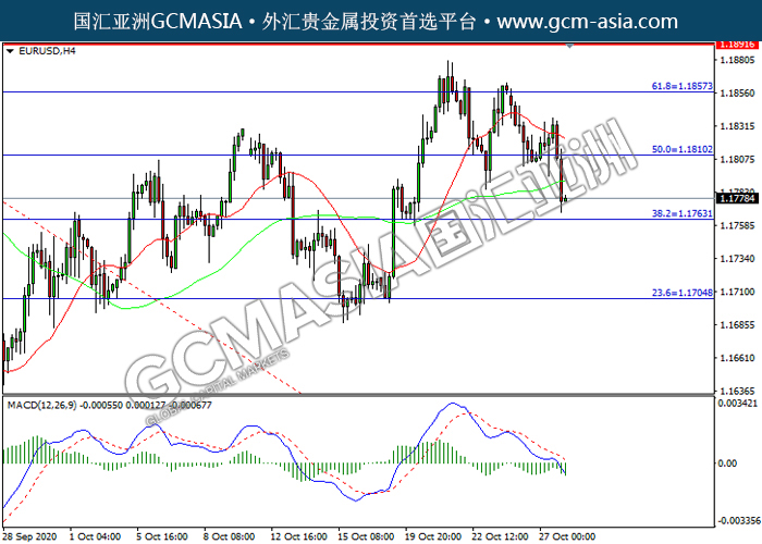 EURUSD,H4:欧美高位回落,目前测试前期支撑。MACD空头动能略增,若下破可关注空头为主。上方关注1.1810压力和1.1855压力,下方关注1.1765支撑和1.1705支撑。
