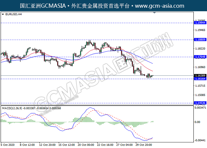 EURUSD,H4:欧美震荡下行,目前测试前期支撑。然而,MACD形成金叉,动能略增,短期关注技术性多头反弹趋势为主。上方关注1.1765压力和1.1880压力,下方关注1.1615支撑和1.1455支撑。