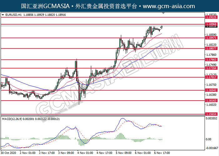 EURUSD,H1:欧美低位反弹上行,目前测试压力位。MACD动能持续略增,若突破可关注多头为主。上方关注1.1895压力和1.1925压力,下方关注1.1845支撑和1.1805支撑。