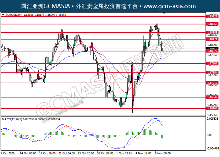 EURUSD,H4:欧美突破后持续下行,目前测试支撑位。MACD动能持续略减,若突破可关注空头为主。上方关注1.1845压力和1.1870压力,下方关注1.1810支撑和1.1765支撑。