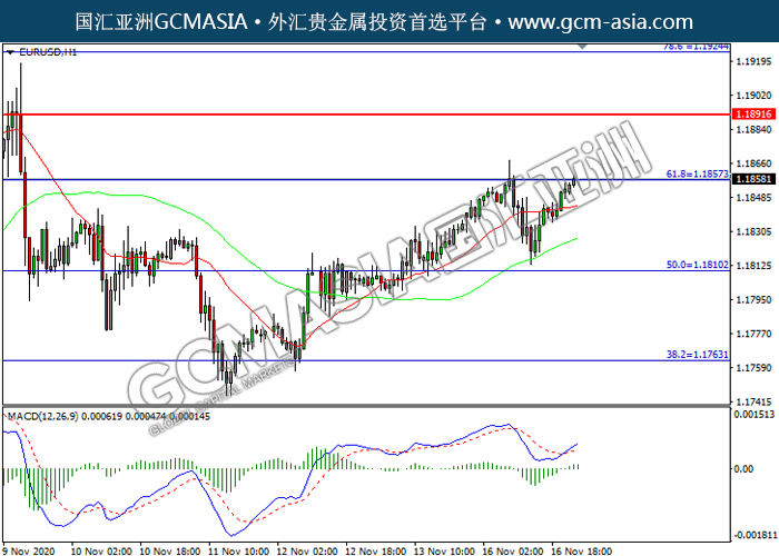 EURUSD,H1:欧美震荡上行,目前测试前期压力。MACD多头动能略增,若突破可关注多头为主。上方关注1.1855压力和1.1890压力,下方关注1.1810支撑和1.1765支撑。