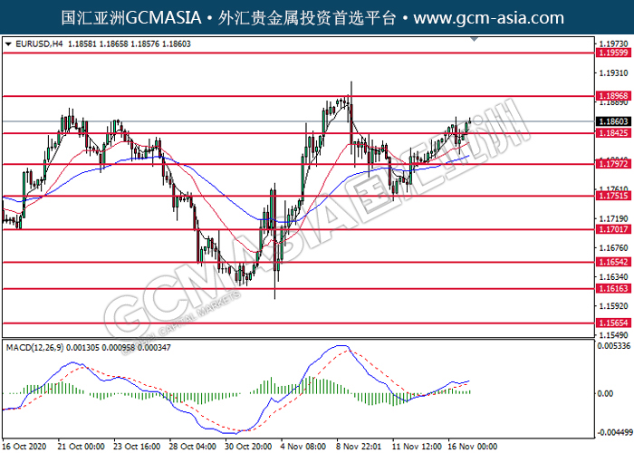 20201117 EURUSD-午间 by keyk | Nov 17, 2020 | 欧元兑美元 | 0 comments GCMAsia - EURUSD EURUSD 2020-11-17 EURUSD,H4:欧美突破后持续上行。MACD动能持续略增,短期可关注多头为主。上方关注1.1895压力和1.1960压力,下方关注1.1845支撑和1.1795支撑。