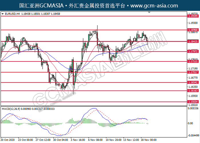 EURUSD,H4:欧美高位承压后回落,目前测试着支撑位。MACD动能持续略减,若突破可关注空头为主。上方关注1.1895压力和1.1960压力,下方关注1.1840支撑和1.1795支撑。