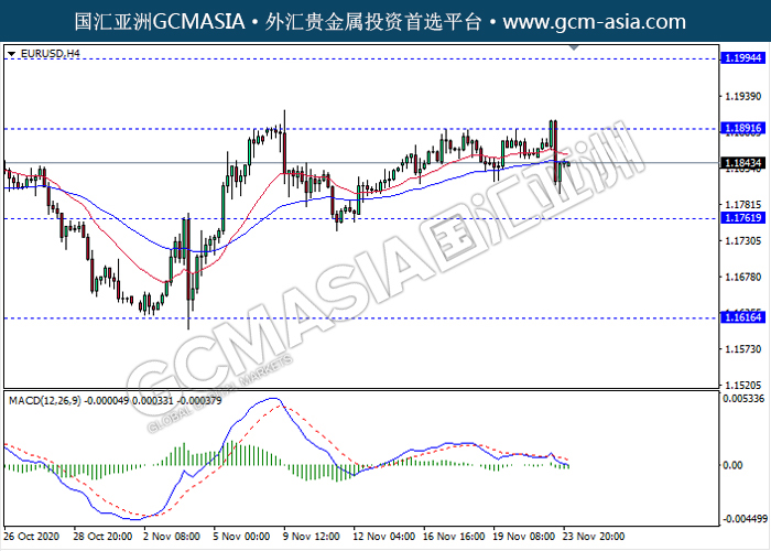 20201124 EURUSD by keyk | Nov 24, 2020 | 欧元兑美元 | 0 comments GCMAsia - EURUSD EURUSD 2020-11-24 EURUSD,H4:欧美高位承压回落下跌。MACD动能略减,短期继续看空回调为主。上方关注1.1890压力和1.1995压力,下方关注1.1760支撑和1.1615支撑。
