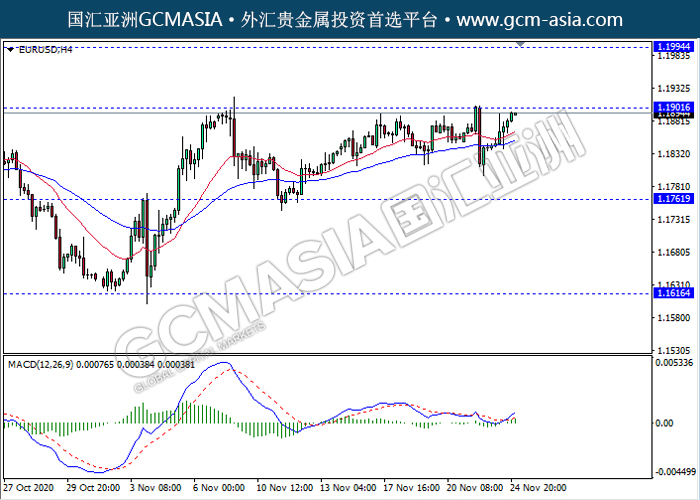 EURUSD,H4:欧美震荡上行,目前测试前期压李。MACD形成金叉,动能略增,若突破继续看多为主。上方关注1.1900压力和1.1995压力,下方关注1.1760支撑和1.1615支撑。