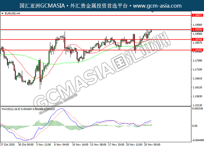 EURUSD,H4:欧美震荡上行,目前测试前期压力。MACD多头动能略增,若突破可关注多头为主。上方关注1.1930压力和1.2005压力,下方关注1.1875支撑和1.1815支撑。