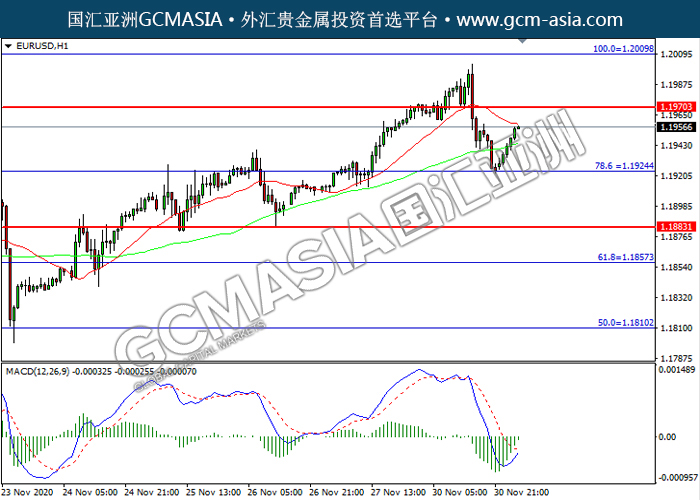 20201201 EURUSD-午间 by keyk | Dec 1, 2020 | 欧元兑美元 | 0 comments GCMAsia - EURUSD EURUSD 2020-12-01 EURUSD,H1:欧美震荡上行。MACD空头动能略减,短期继续看多为主。上方关注1.1970压力和1.2010压力,下方关注1.1925支撑和1.1885支撑。