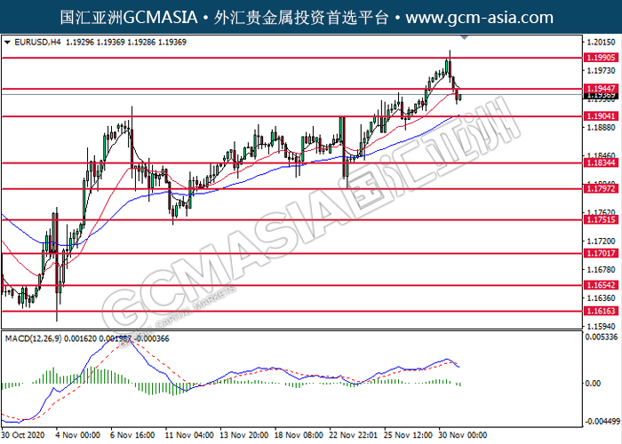 20201201 EURUSD by willy | Dec 1, 2020 | 欧元兑美元 | 0 comments GCMAsia-EURUSD EURUSD 2020-12-01 EURUSD,H4:欧美突破后持续下行。MACD转向空头,动能略减,短期可关注空头为主。上方关注1.1945压力和1.1990压力,下方关注1.1905支撑和1.1835支撑。