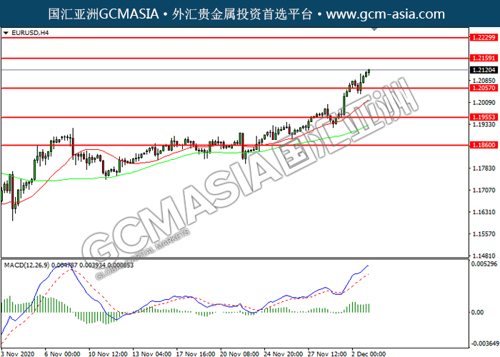 EURUSD,H4:欧美突破前期压力,震荡上行。MACD多头动能略增,短期继续看多为主。上方关注1.2160压力和1.2230压力,下方关注1.2055支撑和1.1955支撑。