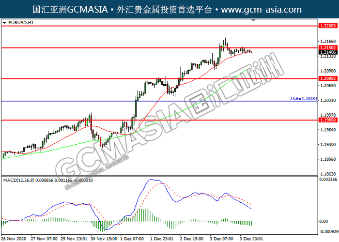 20201204 EURUSD-午间 by keyk | Dec 4, 2020 | 欧元兑美元 | 0 comments GCMAsia - EURUSD EURUSD 2020-12-04 EURUSD,H1:欧美震荡盘整,目前测试前期压力。MACD空头动能略增,短期继续看空为主。上方关注1.2150压力和1.2200压力,下方关注1.2080支撑和1.2030支撑。