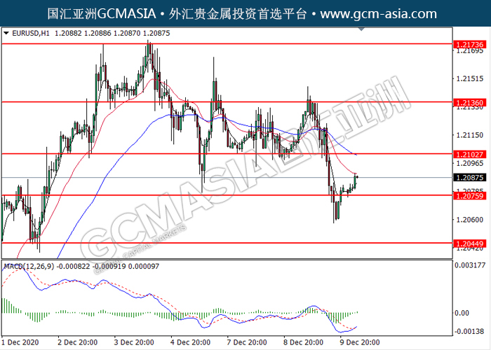 20201210 EURUSD-午间 by keyk | Dec 10, 2020 | 欧元兑美元 | 0 comments GCMAsia-EURUSD EURUSD 2020-12-10 EURUSD,H1:欧美低位反弹。MACD转向多头,动能略增,短期可关注多头为主。上方关注1.2105压力和1.2135压力,下方关注1.2075支撑和1.2045支撑。