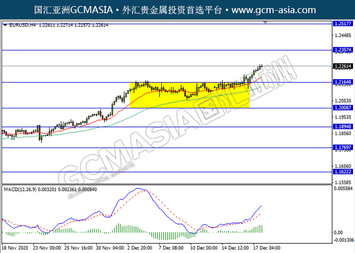 EURUSD,H4:欧美突破前期压力,多头排列。然而,MACD多头动能开始略减,短期关注技术性空头回调趋势为主。上方关注1.2355压力和1.2515压力,下方关注1.2165支撑和1.2010支撑。