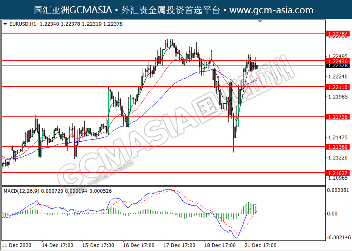 EURUSD,H1:欧美低位反弹,目前测试着压力位。然而,MACD多头动能略减,短期可关注技术性回调。上方关注1.2245压力和1.2280压力,下方关注1.2210支撑和1.2175支撑。