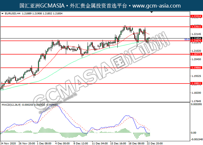 EURUSD,H4:欧美高位回落,目前测试前期支撑。然而,MACD空头动能略减,短期可关注技术性回调为主。上方关注1.2260压力和1.2330压力,下方关注1.2165支撑和1.2075支撑。