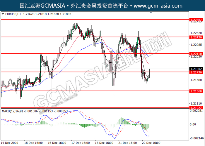 EURUSD,H1:欧美低位反弹,目前测试着压力位。MACD空头动能略减,若成功收线在压力位上方可持续关注可关注多头走势。上方关注1.2175压力和1.2210压力,下方关注1.2135支撑和1.2105支撑。