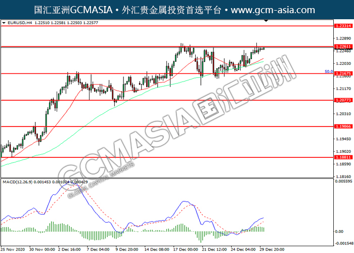 EURUSD,H4:欧美震荡上行,目前测试前期压力。然而,MACD多头动能略减,短期可关注技术性回调。上方关注1.2260压力和1.2330压力,下方关注1.2165支撑和1.2075支撑。