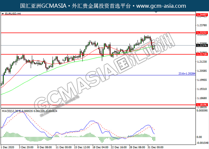 20210104 EURUSD by willy | Jan 4, 2021 | 欧元兑美元 | 0 comments GCMAsia-EURUSD EURUSD 2021-01-04 EURUSD,H4:欧美震荡下行。然而,MACD多头动能略减,短期可关注技术性回调。上方关注1.2325压力和1.2450压力,下方关注1.2175支撑和1.2030支撑。