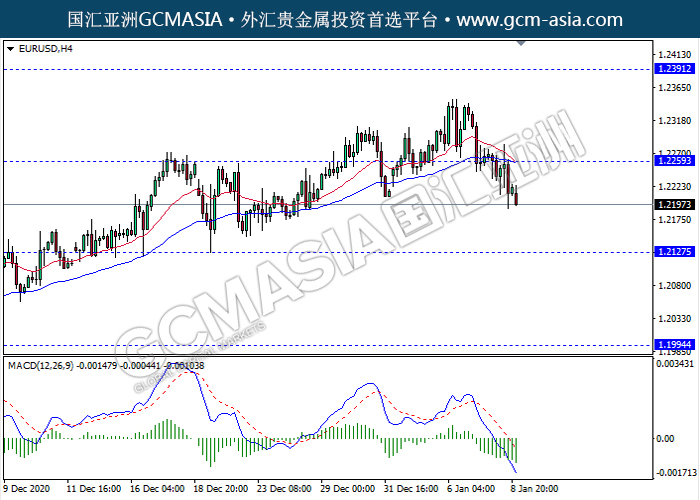 20210111 EURUSD by keyk | Jan 11, 2021 | 欧元兑美元 | 0 comments GCMAsia-EURUSD EURUSD 2021-01-11 EURUSD,H4:欧美高位承压回落下跌。MACD显示空头,动能持续略减,短期继续看空为主。上方关注1.2260压力和1.2390压力,下方关注1.2120支撑和1.1995支撑。