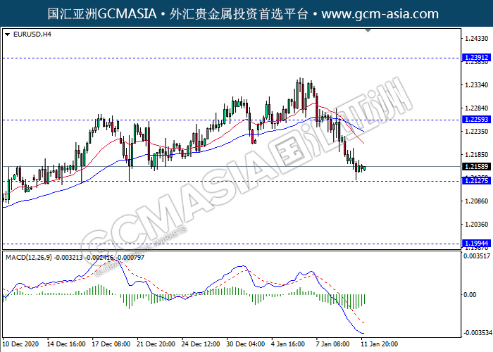 EURUSD,H4:欧美空头排列,目前测试靠近前期支撑。然而,MACD空头动能有所略减,短期关注技术性多头反弹趋势为主。上方关注1.2260压力和1.2390压力,下方关注1.2120支撑和1.1995支撑。