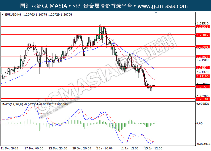 20210119 EURUSD by willy | Jan 19, 2021 | 欧元兑美元 | 0 comments GCMAsia-EURUSD EURUSD 2021-01-19 EURUSD,H4:欧美低位反弹。MACD空头动能略减,短期可关注多头走势。上方关注1.2120压力和1.2155压力,下方关注1.2070支撑和1.2020支撑。