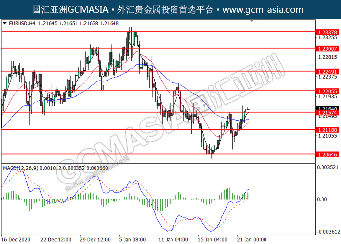 20210122 EURUSD by willy | Jan 22, 2021 | 欧元兑美元 | 0 comments GCMAsia-EURUSD EURUSD 2021-01-22 EURUSD,H4:欧美突破后持续上行。MACD多头动能略增,短期可关注多头走势。上方关注1.2205压力和1.2250压力,下方关注1.2155支撑和1.2120支撑。