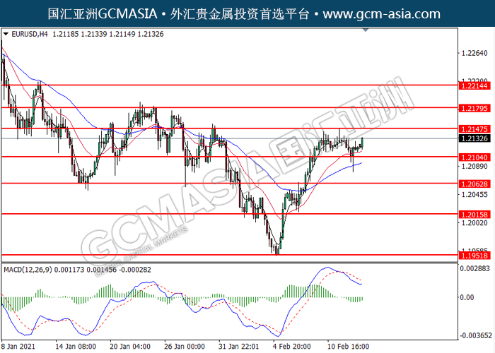 20210215 EURUSD-午间 by willy | Feb 15, 2021 | 欧元兑美元 | 0 comments GCMAsia - EURUSD EURUSD 2021-02-15 EURUSD,H4:欧美低位反弹。MACD空头动能略减,短期可关注多头走势。上方关注1.2145压力和1.2180压力,下方关注1.2105支撑和1.2065支撑。