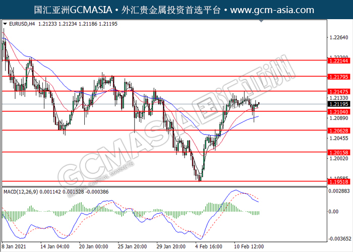 20210215 EURUSD by willy | Feb 15, 2021 | 欧元兑美元 | 0 comments GCMAsia - EURUSD EURUSD 2021-02-15 EURUSD,H4:欧美低位反弹。MACD空头动能略减,短期可关注多头走势。上方关注1.2145压力和1.2180压力,下方关注1.2105支撑和1.2065支撑。