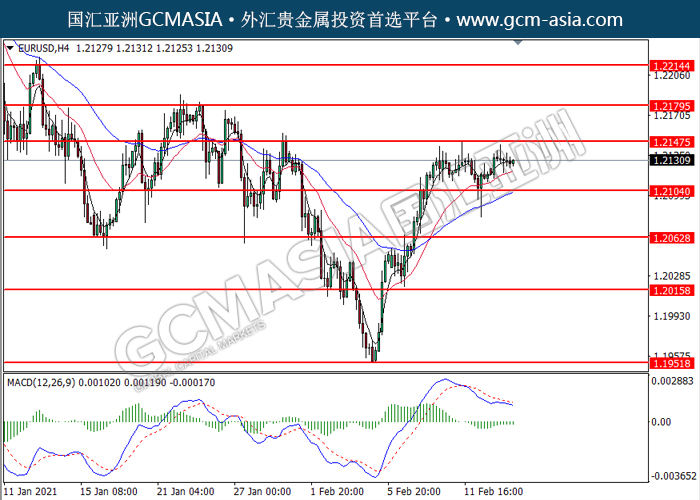 20210216 EURUSD by willy | Feb 16, 2021 | 欧元兑美元 | 0 comments GCMAsia - EURUSD EURUSD 2021-02-16 EURUSD,H4:欧美低位反弹。MACD空头动能略减,短期可关注多头走势。上方关注1.2145压力和1.2180压力,下方关注1.2105支撑和1.2065支撑。