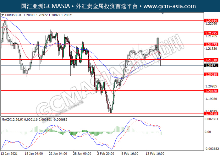20210217 EURUSD-午间 by keyk | Feb 17, 2021 | 欧元兑美元 | 0 comments GCMAsia-EURUSD EURUSD 2021-02-17 EURUSD,H4:欧美突破后持续下行。MACD空头动能略增,短期可关注空头走势。上方关注1.2105压力和1.2145压力,下方关注1.2065支撑和1.2015支撑。