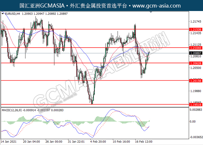 20210219 EURUSD by willy | Feb 19, 2021 | 欧元兑美元 | 0 comments GCMAsia - EURUSD EURUSD 2021-02-19 EURUSD,H4:欧美突破后持续上行。MACD多头动能略增,短期可关注多头走势。上方关注1.2105压力和1.2155压力,下方关注1.2065支撑和1.2015支撑。