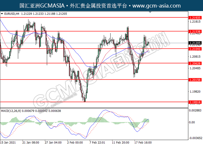 20210222 EURUSD by willy | Feb 22, 2021 | 欧元兑美元 | 0 comments GCMAsia - EURUSD EURUSD 2021-02-22 EURUSD,H4:欧美低位反弹。然而,MACD多头动能略减,短期可关注技术性回调。上方关注1.2155压力和1.2195压力,下方关注1.2105支撑和1.2065支撑。