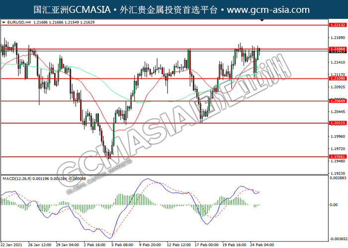 EURUSD,H4:欧美低位反弹,目前测试前期压力。MACD空头动能开始略减,若突破可关注多头为主。上方关注1.2165压力和1.2215压力,下方关注1.2110支撑和1.2065支撑。