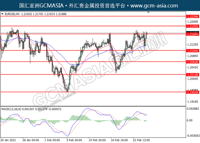 EURUSD,H4:欧美低位反弹,目前测试着压力位。MACD空头动能略减,若突破可关注多头趋势。上方关注1.2165压力和1.2195压力,下方关注1.2105支撑和1.2065支撑。