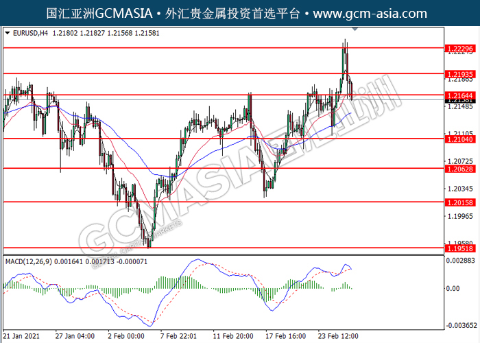 EURUSD,H4:欧美高位承压后回落,目前测试着支撑位。MACD多头动能略减,若突破可关注空头趋势。上方关注1.2195压力和1.2230压力,下方关注1.2165支撑和1.2105支撑。
