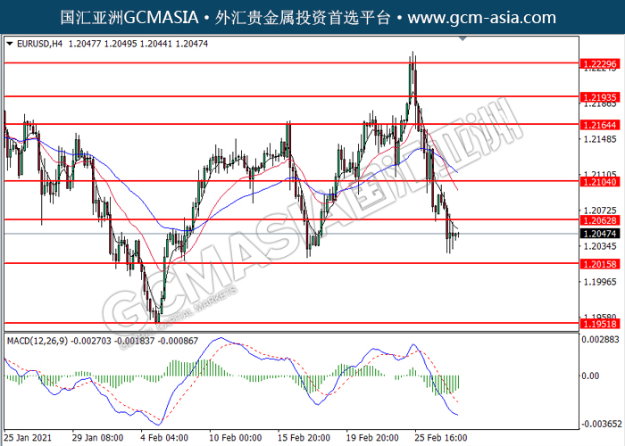 20210302 EURUSD by willy | Mar 2, 2021 | 欧元兑美元 | 0 comments GCMAsia - EURUSD EURUSD 2021-03-02 EURUSD,H4:欧美突破后持续下行。然而,MACD空头动能略减,短期可关注技术性回调。上方关注1.2065压力和1.2105压力,下方关注1.2015支撑和1.1950支撑。