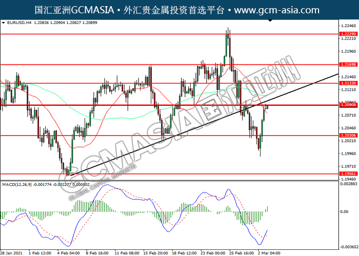 EURUSD,H4:欧美震荡上行,目前测试前期压力。MACD已形成金叉,动能转强,短期可关注多头为主。上方关注1.2090压力和1.2135压力,下方关注1.2030支撑和1.1955支撑。