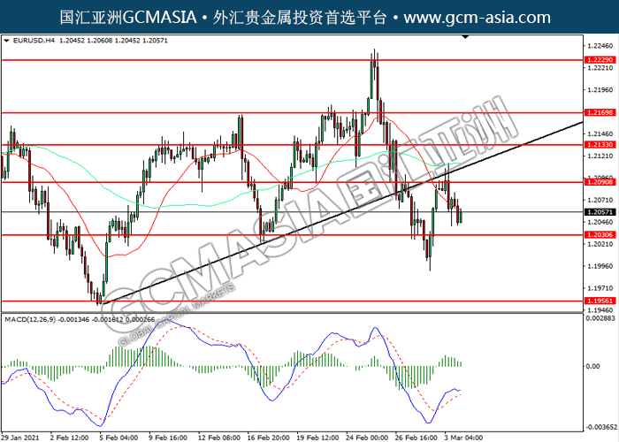 EURUSD,H4:欧美震荡下行,目前靠近前期支撑。MACD多头动能略减,若下破可关注空头为主。上方关注1.2090压力和1.2135压力,下方关注1.2030支撑和1.1955支撑。