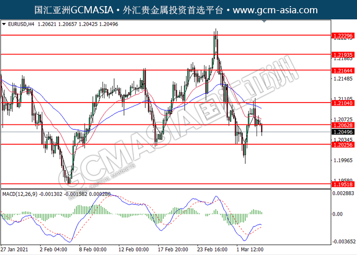 EURUSD,H4:欧美突破后持续下行,目前测试着支撑位。MACD多头动能略减,若突破可关注空头趋势。上方关注1.2105压力和1.2165压力,下方关注1.2065支撑和1.2025支撑。