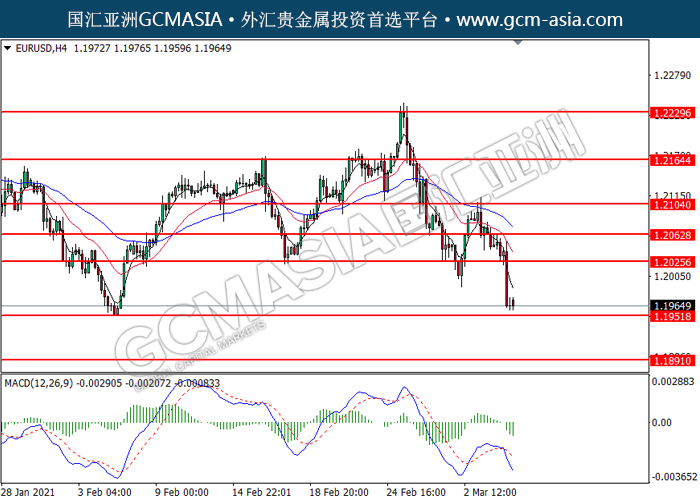 EURUSD,H4:欧美突破后持续下行,目前测试着支撑位。MACD空头动能略增,若突破可关注空头趋势。上方关注1.2025压力和1.2065压力,下方关注1.1950支撑和1.1890支撑。