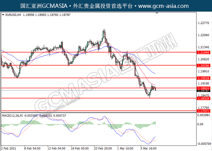 EURUSD,H4:欧美高位承压后回落。然而,MACD多头动能略减,短期可关注空头趋势。上方关注1.1890压力和1.1950压力,下方关注1.1830支撑和1.1755支撑。