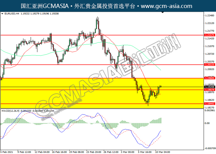 20210311 EURUSD by willy | Mar 11, 2021 | 欧元兑美元 | 0 comments GCMAsia-EURUSD EURUSD 2021-03-11 EURUSD,H4:欧美突破前期压力,震荡上行。MACD多头动能持续略增,短期可关注多头为主。上方关注1.1960压力和1.2020压力,下方关注1.1910支撑和1.1845支撑。